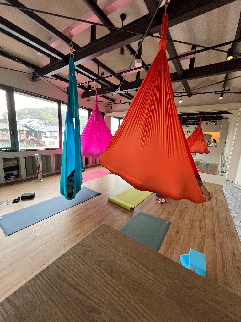 今月にオープンしたばかりの二宮店、ぜひお越しください。エアリアルヨガの予約枠は、残りわずかとなっております。