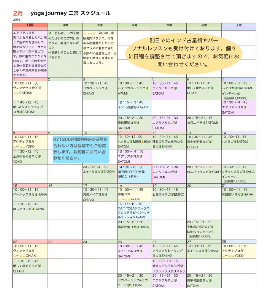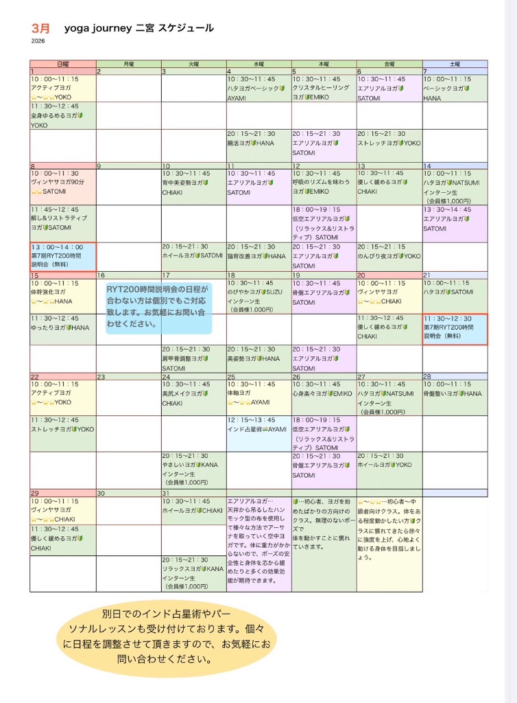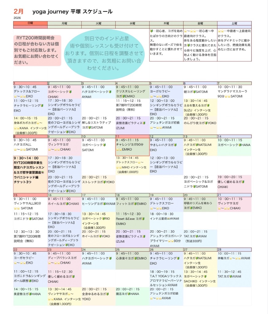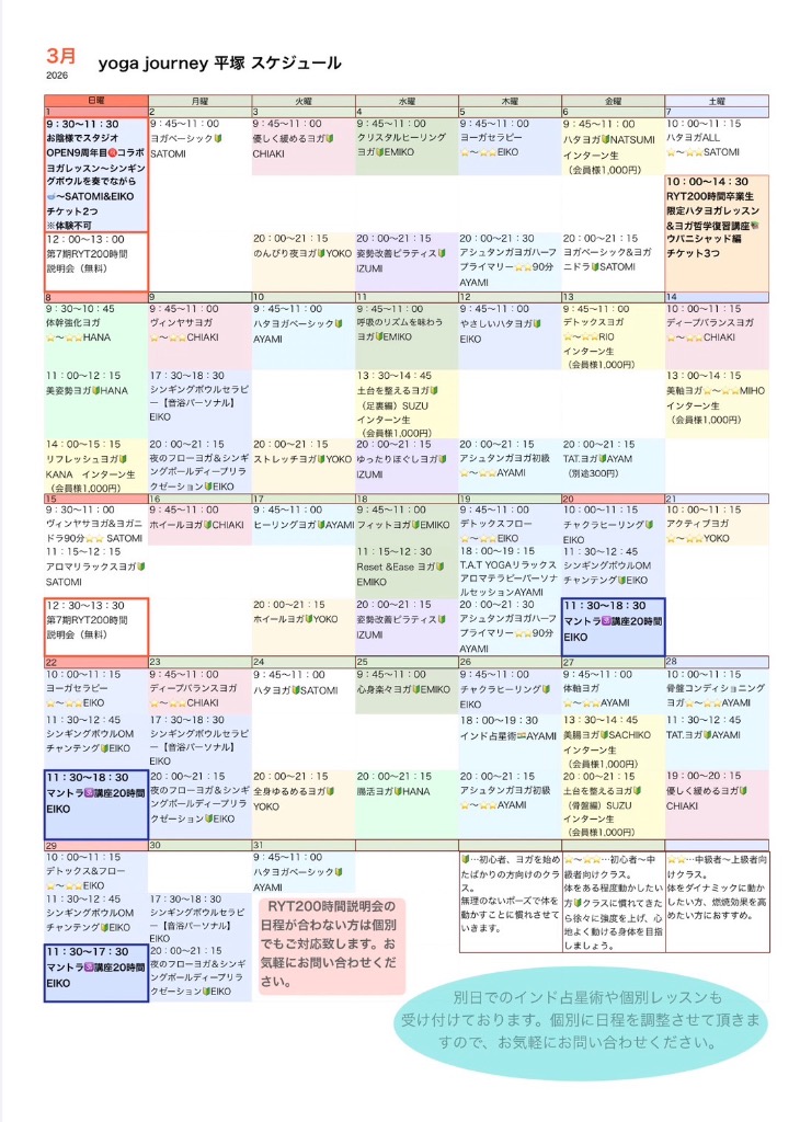 ご利用者の声 平塚店 レッスンスケジュール 二宮店 レッスンスケジュール よくある質問 エアリアルヨガの受講をご検討されている方へ ご利用者の声 初心者にもおすすめ 仕事や毎日の生活に疲れを感じていたのですが、ヨガを始てから疲れにくく少しずつ体が変化していくのを感じました。仕事終わりの夜のクラスは今日は疲れたから行くのをやめようかなと思う時もありますが、やっぱり行くと体が楽になるのが分かるので、夜の寝つきも良くなり、毎日のだるさも少し改善された感じがします。(50代・女性) 身体が硬くても始められる 運動が苦手な私でもできそうな運動を探していたところヨガと出会いました。ヨガは身体が柔らかい人がやるというイメージがあり、身体の硬い私でもできるのか少し不安でしたが、初心者でも無理のないレッスンだったのでとても楽しく行うことができました。終わった後は疲労感ではなく身体全体がスッキリした感じがしてとても気持ちよかったです。(30代・女性) 体が暖かく、体温が上がりました! 1年中体の冷えに悩まされていて、冬になるとたくさん着込んでいるのに全身の冷えから代謝も悪かったのですが、ヨガを始めてから末端冷えも改善され、たくさん着込むことが減りました。体を気持ち良く動かし、体のことも詳しく教えてくださる先生方のアドバイスもあり、ただレッスンを受けるだけではなく先生との距離も近いので質問しやすい環境も良いです。これからもよろしくお願い致します。(40代・女性) 平塚店 レッスンスケジュール 2月、3月スケジュール ※スケジュールをクリックすると拡大サイズでご覧いただけます。体験レッスンは随時受付中‼️ 体験をご希望の方は、受けられたいお日にち、開始時間、レッスン名をお申込み、お問い合わせからご連絡ください。体験レッスンの受付はレッスン開始4時間前までとなります。レッスン強度🔰…身体をあまり動かない方、ヨガが初めてな方向けクラス。⭐️〜⭐️⭐️…普段からストレッチをしていたり、身体をある程度動かしたい方向けのクラス。⭐️⭐️…中級者から上級者向けのクラス。身体をダイナミックに動かしたい方、脂肪燃焼を高めたクラス。 二宮店 レッスンスケジュール 2月、3月スケジュール ※スケジュールをクリックすると拡大サイズでご覧いただけます。 体験レッスンは随時受付中‼️ 体験をご希望の方は、受けられたいお日にち、開始時間、レッスン名をお申込み、お問い合わせからご連絡ください。 体験レッスンの受付はレッスン開始4時間前までとなります。レッスン強度 🔰…身体をあまり動かない方、ヨガが初めてな方向けクラス。 ⭐️〜⭐️⭐️…普段からストレッチをしていたり、身体をある程度動かしたい方向けのクラス。 ⭐️⭐️…中級者から上級者向けのクラス。身体をダイナミックに動かしたい方、脂肪燃焼を高めたクラス。 エアリアルヨガも体験可能です。 よくある質問 Q.男性でもエアリアルヨガに参加できますか? A:申し訳ございませんが、男性の方はお断りさせていただいております。通常クラスでのご参加をお願い致します。 Q.駐車場はありますか? A.平塚店:専用駐車場3台、近くにコインパーキングもあります。 二宮店:なし ※駐輪場あり 但し、スタジオから徒歩5分ぐらいに公共施設である生涯学習センターがございます。そちらの駐車場がご利用可能です。 Q.身体が硬くてもヨガはできますか? A.もちろんできます。身体が硬い方こそ伸びしろがあります。 Q:平塚店と二宮店でチケットを共有できますか? A:可能です。ただし、平塚店のチケットをお持ちの方は差額分を現金でのお支払いとなります。詳しくは直接スタッフへお尋ねください。 Q.自分に合ったレベルがわかりませんが大丈夫ですか? A.レッスンの強度は幅広く用意しております。もし、レッスン強度がご心配の方は、スケジュールにある初心者マーク🔰のあるクラスを体験レッスンにお選び下さい。 Q.どのような服装がベストですか? A.動きやすい服装が最適です。(エアリアルヨガを受講される場合は、ロングTシャツとレギンスがベストです。ゆとりのあるもの、速乾性がある生地はお控えください。) Q.何歳から通えますか? A.中学生から通えます。小学生まではキッズヨガになりますが当店ではキッズヨガは行っておりません。 Q.チケットは共有できますか? A.6回券以外の回数券は夫婦共有可能、友達やカップルでは共有できません。親子でも共有できますが(お子さんが学生の場合のみ)、たくさんレッスンを受けたいお子さんが学生の場合は学生料金のほうがお安くご利用できます。 Q.子供を連れて行ってもいいですか? A.申し訳ありませんがお子さまを連れてのご受講はお断りしております。ただし、お子さま連れも可能なクラスもあるので別途お問い合わせください。※現在は開催しておりません。 Q.ヨガマットは貸してもらえますか? A.平塚店、二宮店ともにフリーマットのご用意がございますの