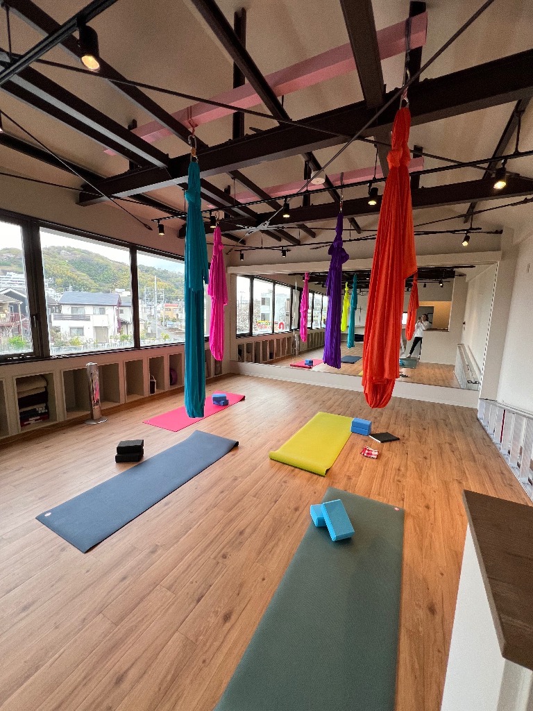 今月にオープンしたばかりの二宮店、ぜひお越しください。エアリアルヨガの予約枠は、残りわずかとなっております。
