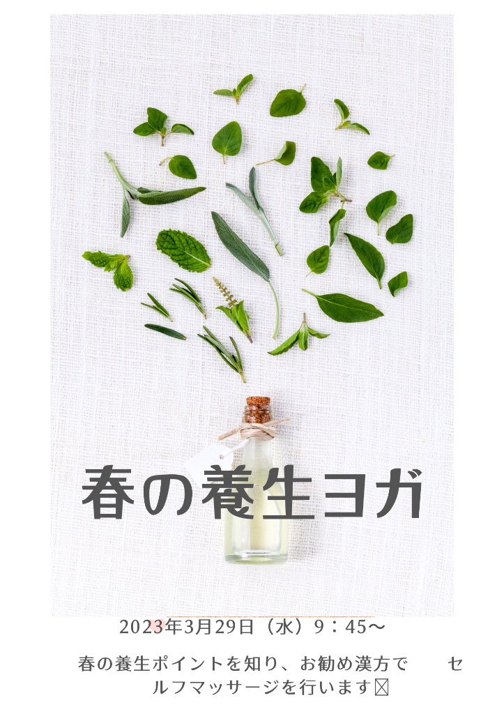春の養生ポイントを知り、肝気の流れを促すポーズや春にオススメの漢方アロマオイルで、セルフマッサージを行なっていきましょう。どなたでもご参加いただけます。